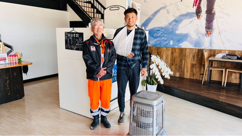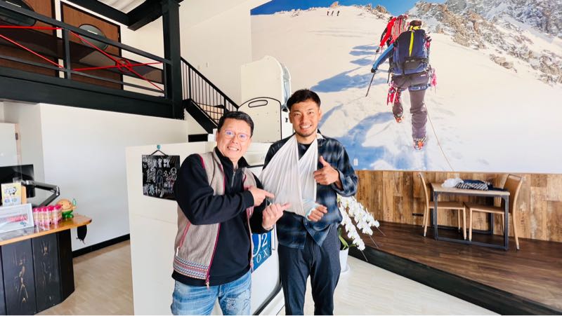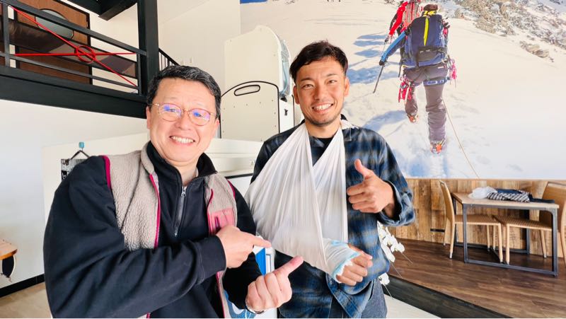 腕にギプスが見えます。実は星野選手、レースで骨折されて治療中なのです。少しでも早く治したいと、酸素ボックスに入る為にお越し下さいました。