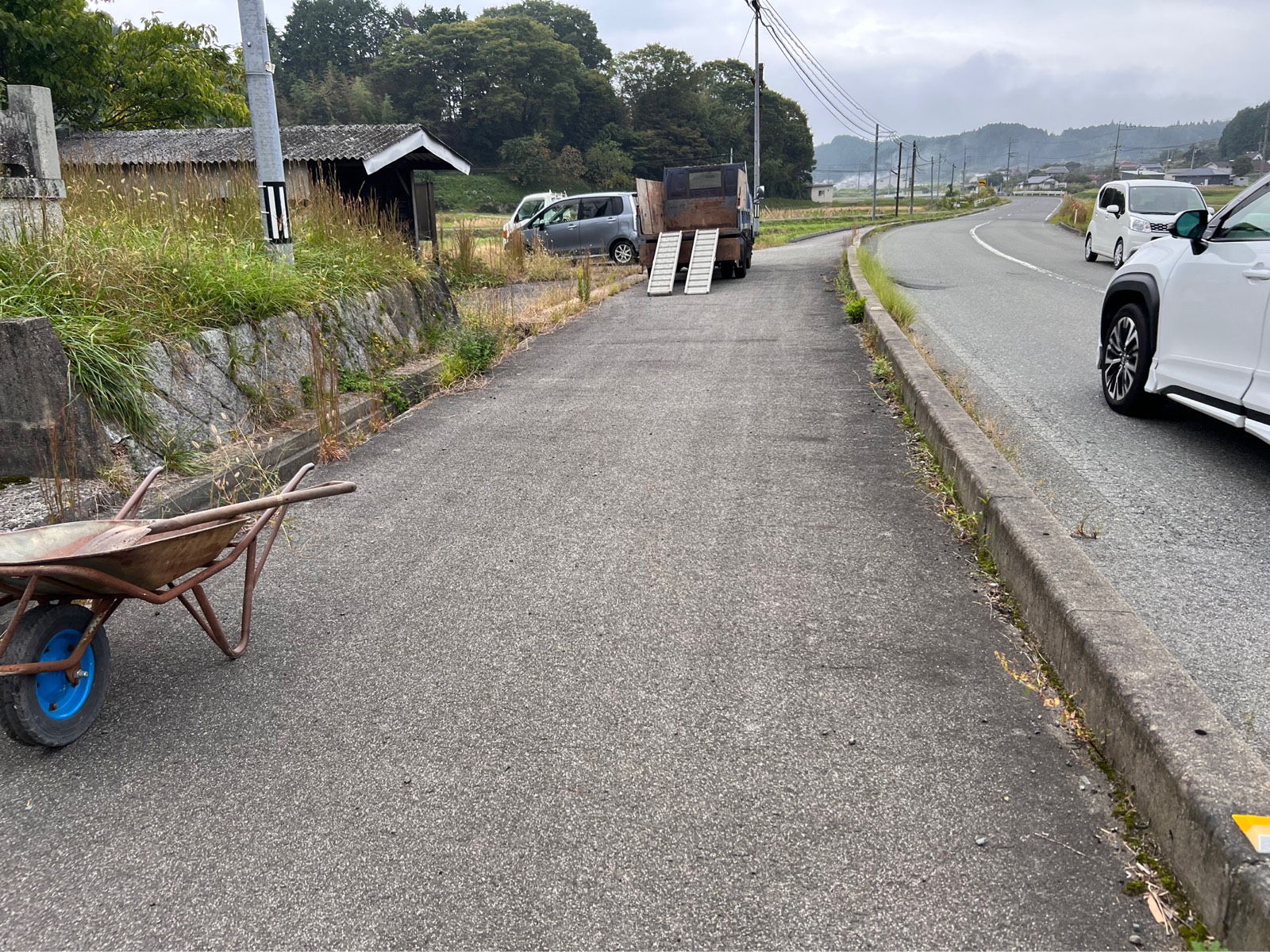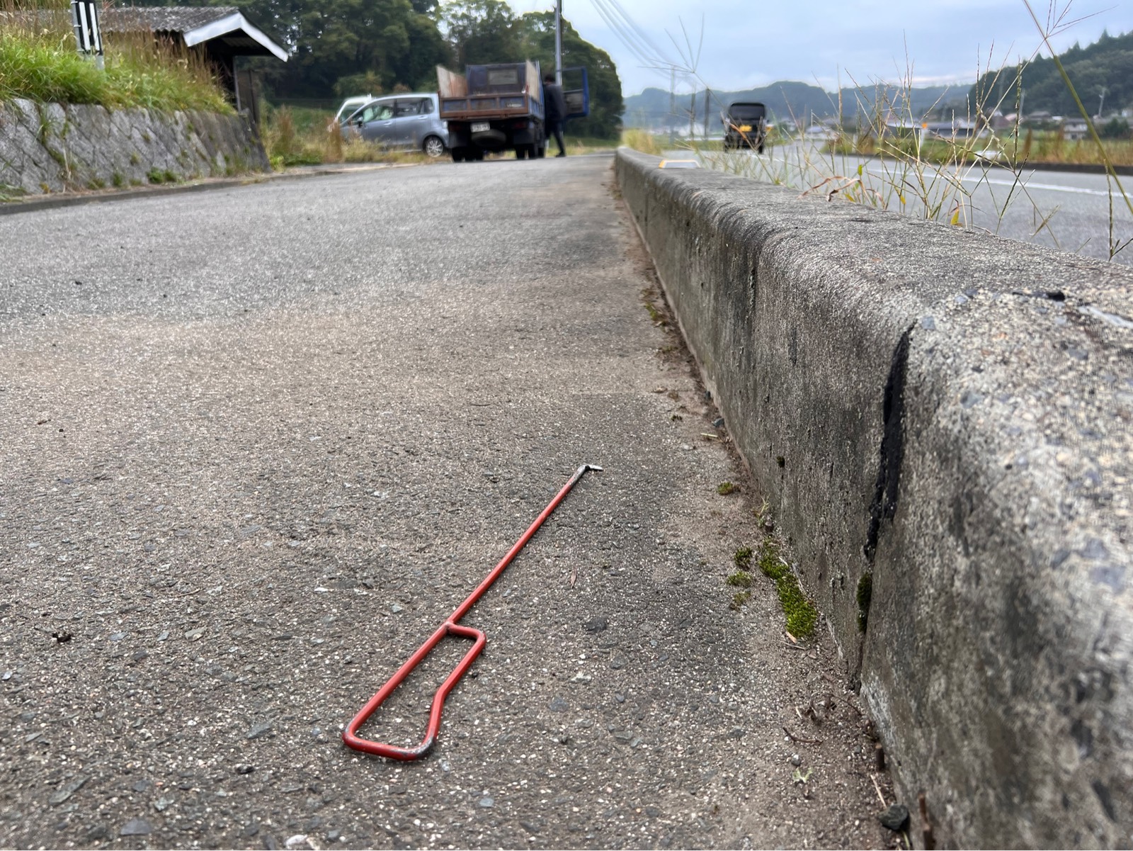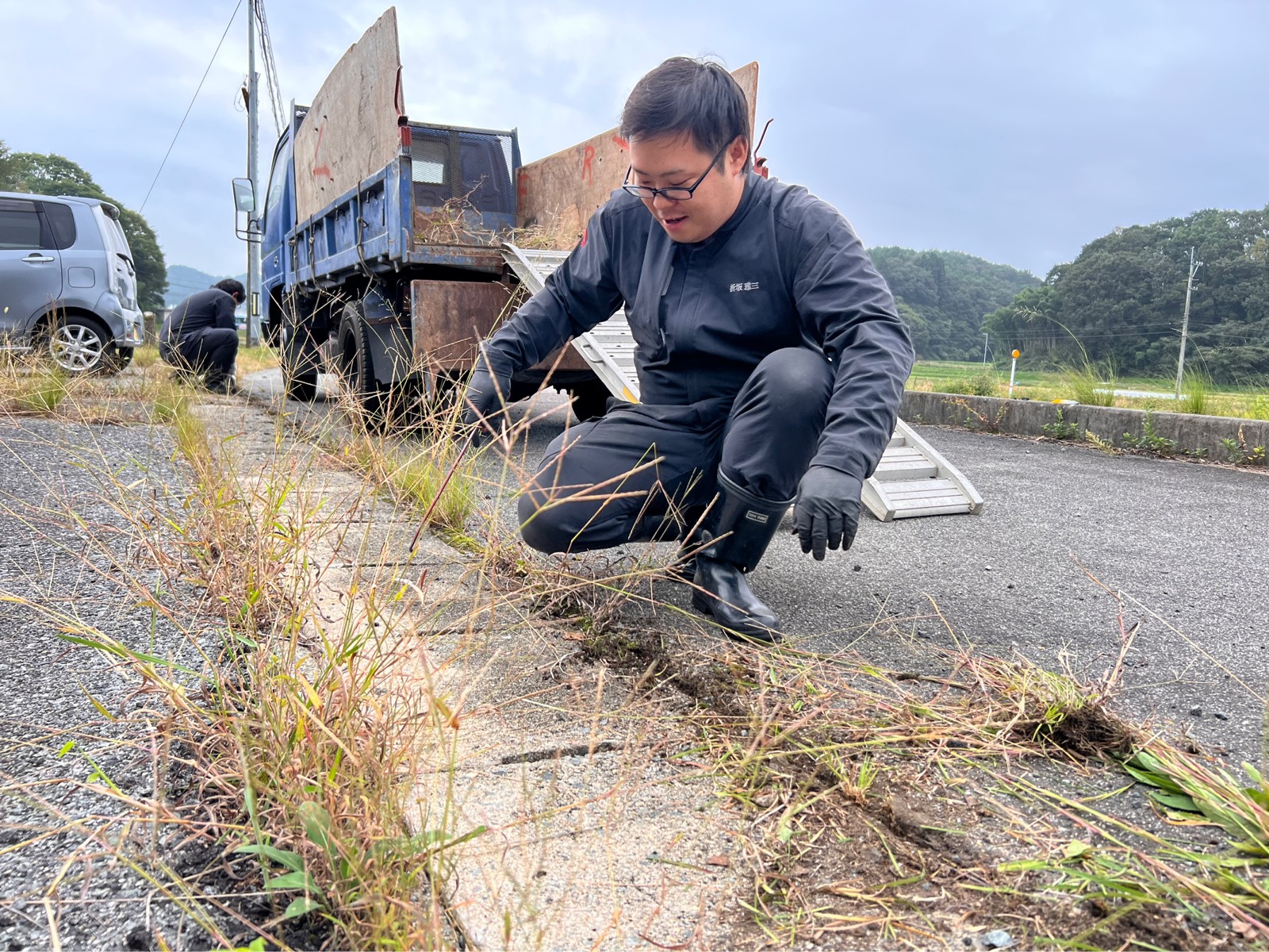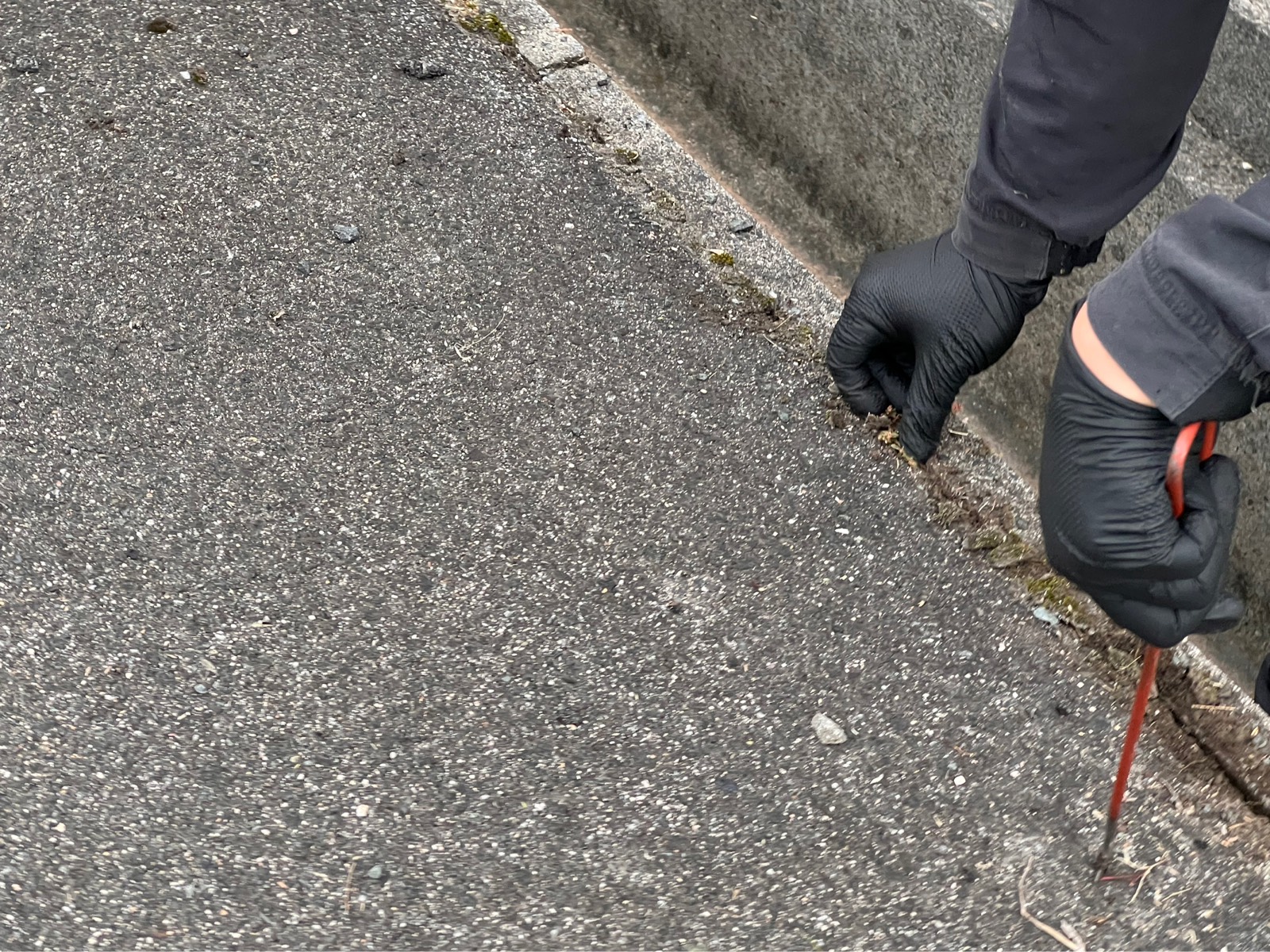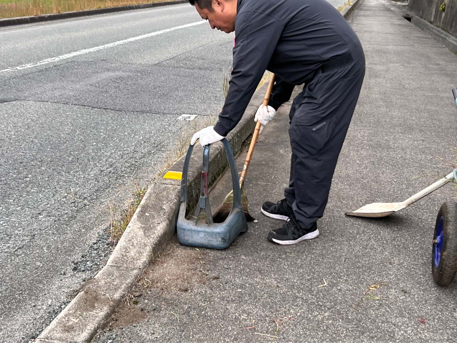 朝の通勤自動車が通る横の歩道周辺を徹底的に清掃します。