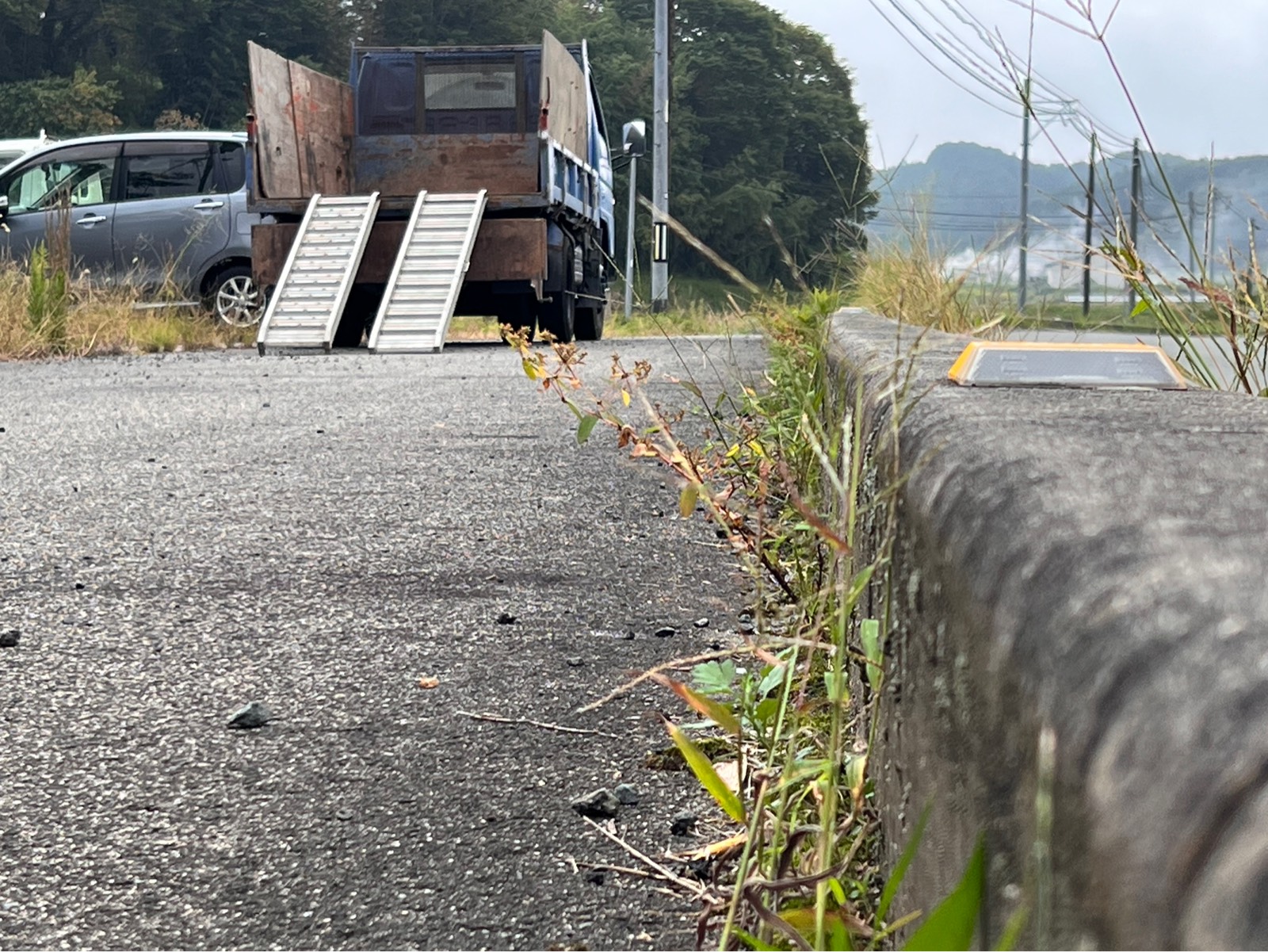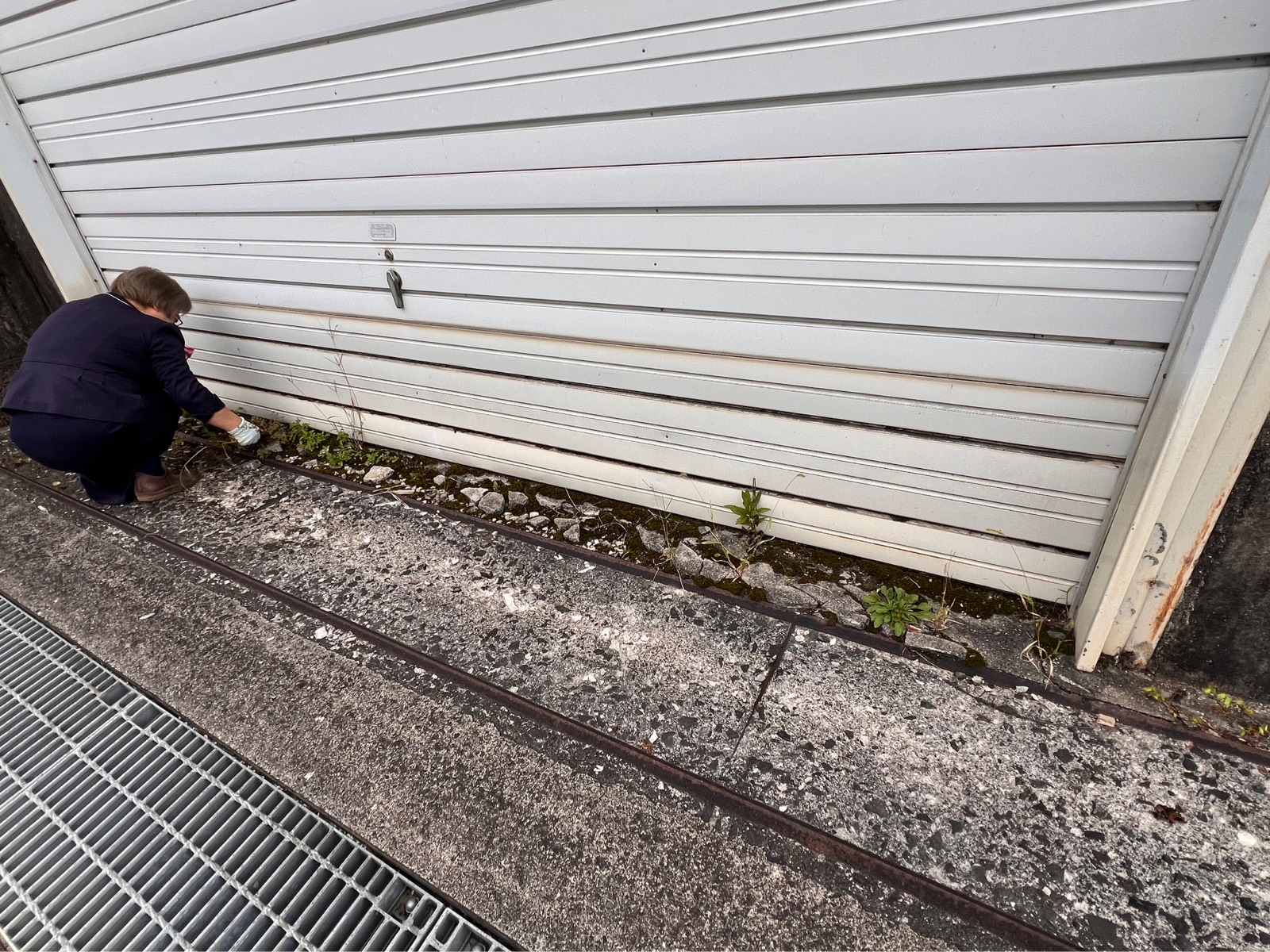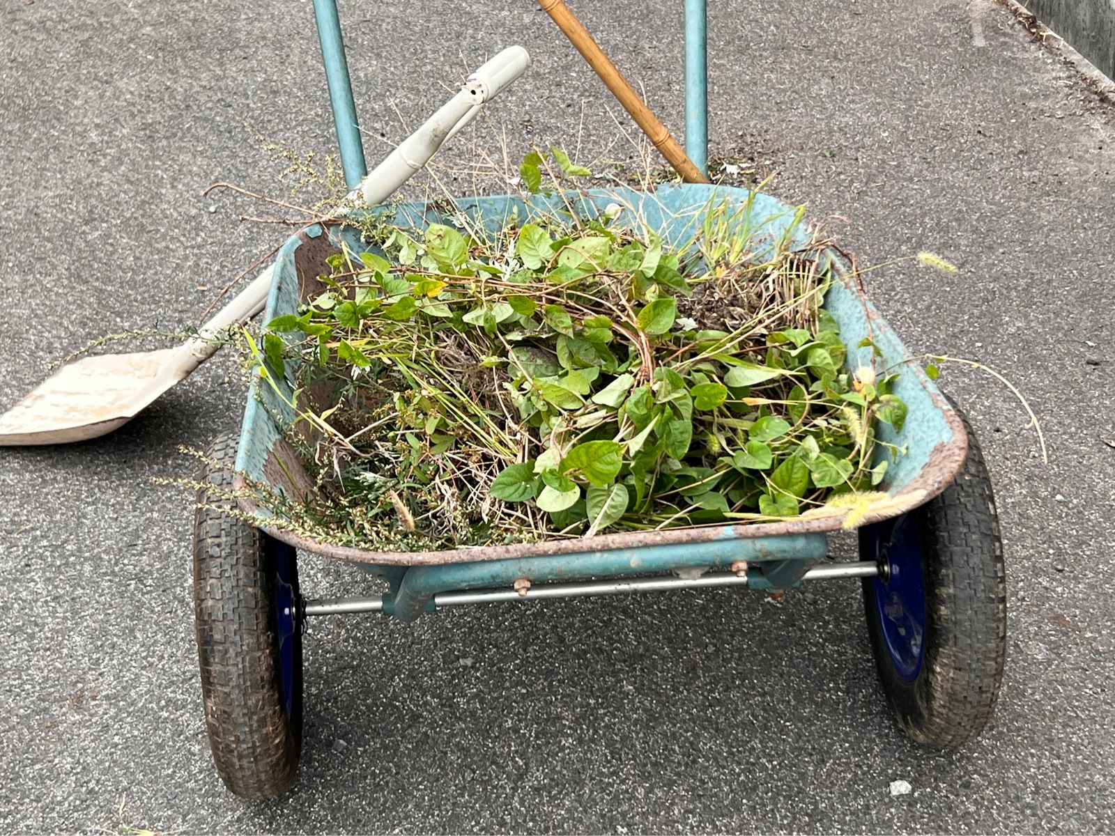 ブロック塀の雑草は無理に引き抜かず、鎌で切り取ります。