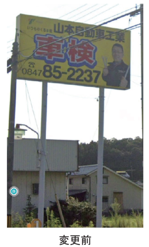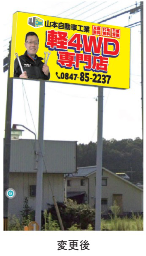 2枚目は変更後のイメージです。施工は、店舗前が府中のタテイシ広美社さん、野立て看板はこれまでと同様に関西広告社さんへお願いしました。そして今回はより視認性と専門性を意識したデザインへと進化しております。