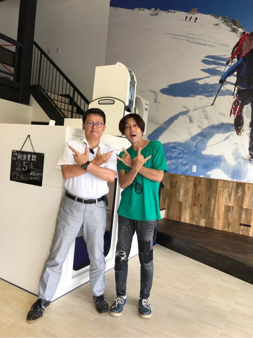 今日は何と、福山の稲葉と呼ばれるオトコ、松井さんが酸素ボックスの体験に来てくれました。